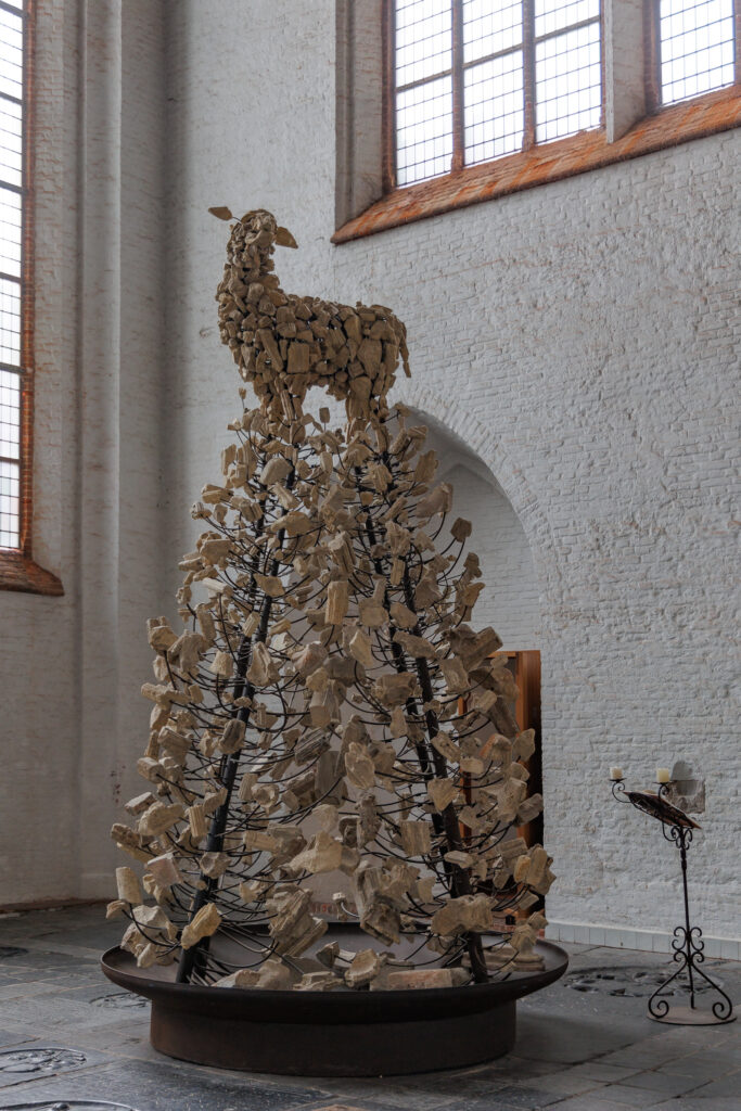 Een lam.Niet zomaar een lam, het is het lam van God. Jezus. Het beeld is gemaakt door de Schiedamse kunstenaar Sjef Henderickx (1944-2022) voor de Grote- of St. Janskerk in Schiedam. Het beeld is opgebouwd uit brokstukken van beelden en altaren die tijdens de beeldenstorm zijn stukgeslagen, vernield. * Ook in onze tijd is er …